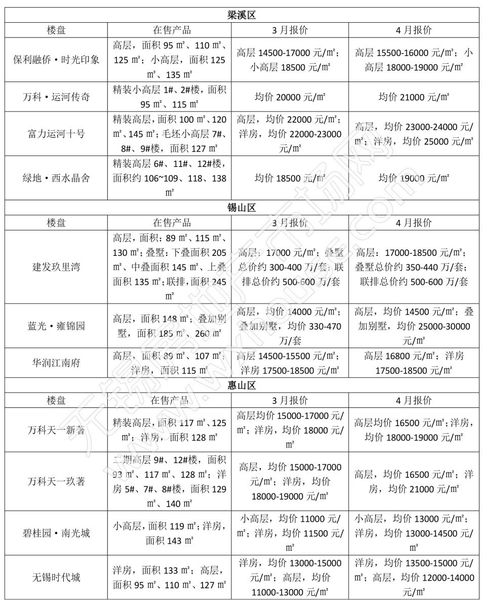 五区中梁溪、锡山、惠山三区部分在售产品价格浮动较大。梁溪区为锡城老牌中心区域,各项配套均十分完善,加上在售项目不多,库存有限,近来在售产品价格有所上浮也在情理之中;惠山区在售项目多为进一步缩减优惠力度,因此相对此前报价来看确实略有上涨,但就目前来说惠山区房源仍属于锡城高性价比产品;锡山区近年来区域配套发展迅速,地铁、商业配套、环境配套以及教育配套的飞速变现抬高了区域身价,房价跟着傲娇意料之中。