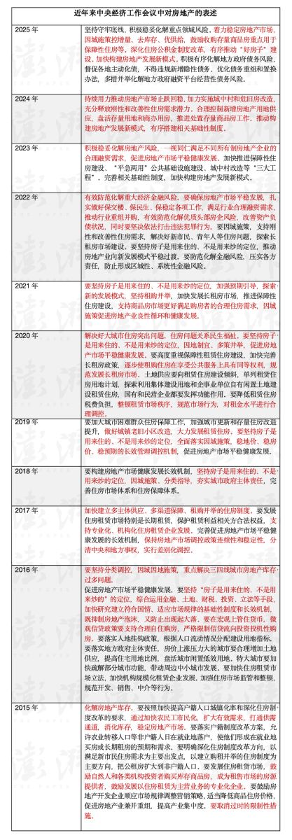 对于明年房地产市场的定调,会议提出“着力稳定房地产市场”。这是继2024年中央经济工作会议提出“持续用力推动房地产市场止跌回稳”后,中央经济工作会议再次强调“稳楼市”。