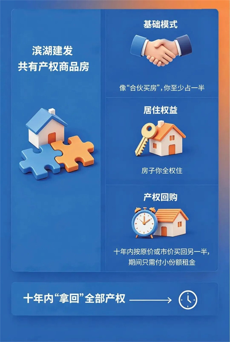为落实提振住房消费、强化人才安居保障、增进民生福祉等工作部署,让就业创业人才能够更轻松、安心地实现安家置业,滨湖建发集团第一时间推出 “共有产权商品房” 试点安居新模式。该模式可与人才购房补贴叠加申请,即符合条件在滨湖工作缴纳社保的人才购买共有产权商品房时,可同时享受人才购房券和共有产权低门槛置业双重支持,十年内可逐步“拿回”全部产权。