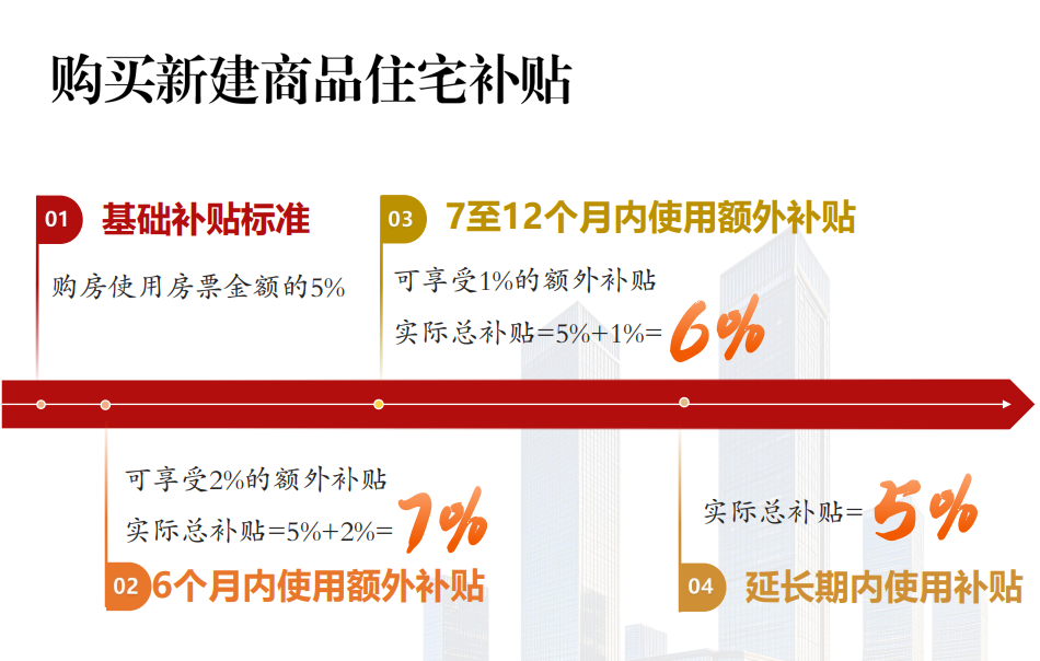 根据政策,被征收户使用房票购买新建商品住宅,可享受购房使用房票金额5%的基础补贴。若在房票开具后6个月内购房,额外补贴2%,总补贴达7%;在7至12个月内购房,额外补贴1%,总补贴为6%。
