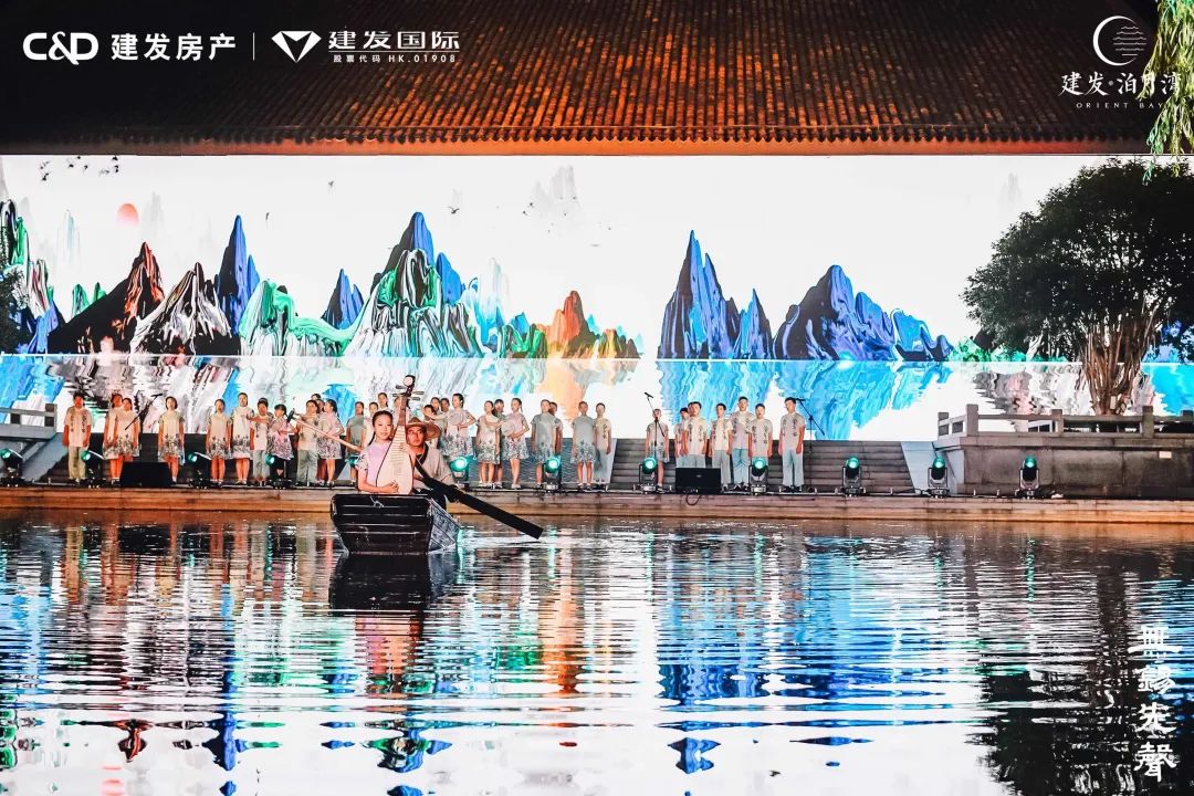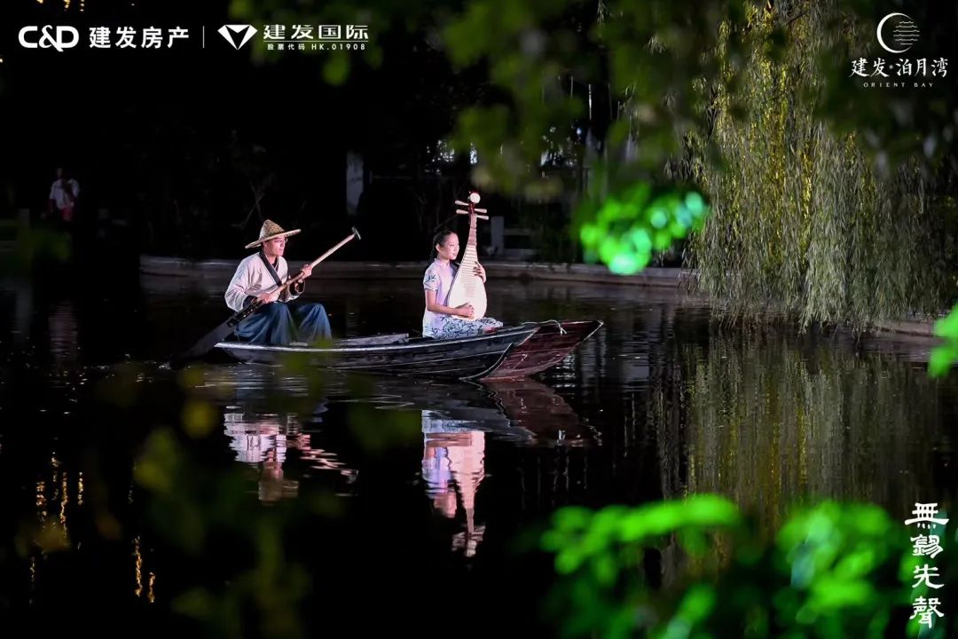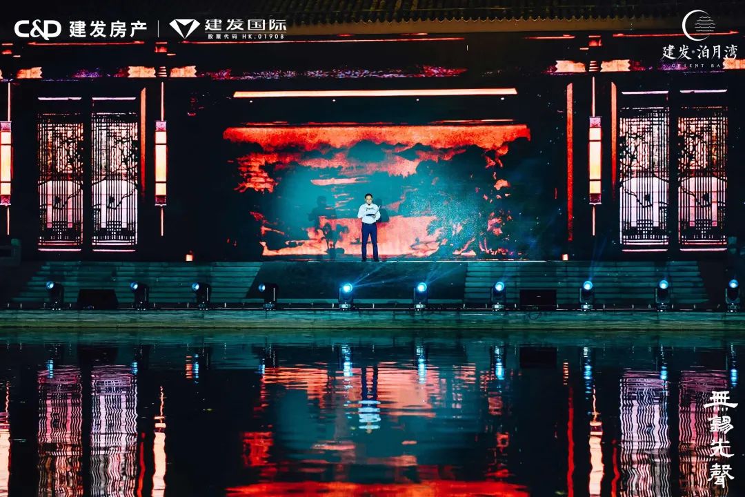 园林意境间,莲池映月,光影璀璨,折射出沉淀着历史文化的古韵空间,亭台楼阁,花木廊桥,飞檐屋脊,花窗框景,与民乐清音相呼应,营造出游园惊梦般的现场氛围。