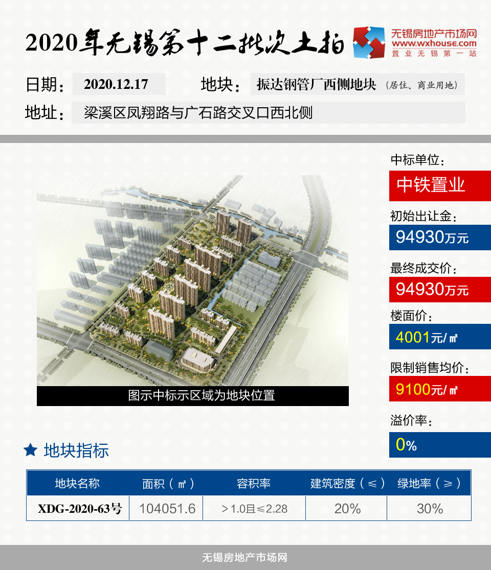 振达钢管厂西侧地块(XDG-2020-63号地块)——中铁置业集团上海投资发展有限公司——楼面价:4001.47元/平方米