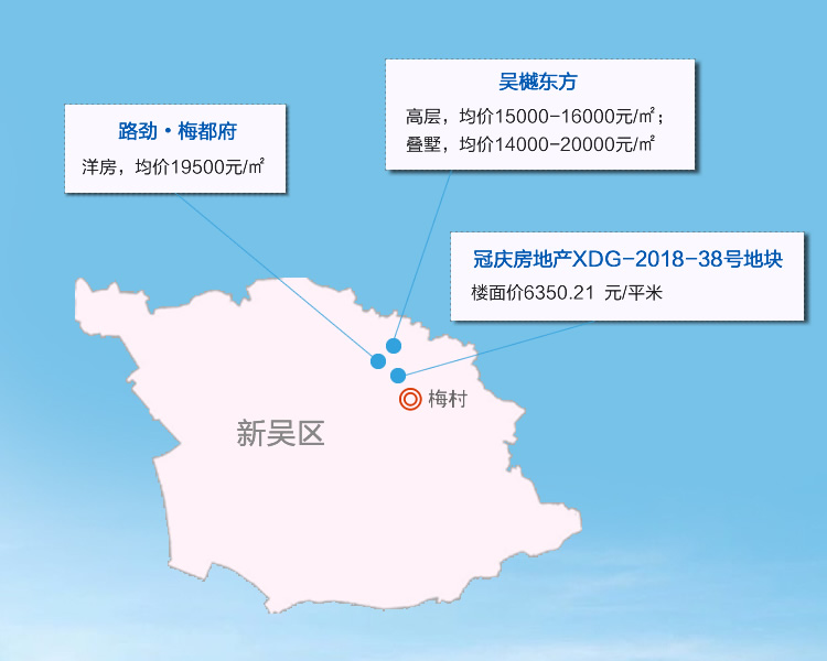 梅村土地也随着万科的入驻,关注度大幅提升。2017年8月,保利地产溢价竞得XDG-2017-11号地块,楼面价迈入“7”字头,此后区域地价一路上涨,到2019年8月,新挂牌的梅村东方驾校地块(XDG-2019-28号地块)起始楼面价达到了8878元/平米。