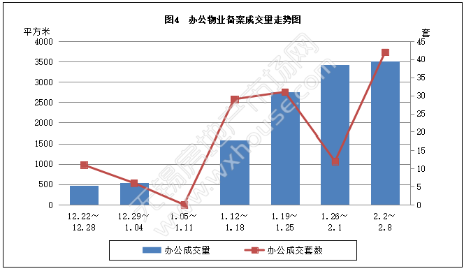 本周办公物业备案成交面积为0.35万平方米,环比增幅2.91%,备案成交套数为42套,环比增加30套。