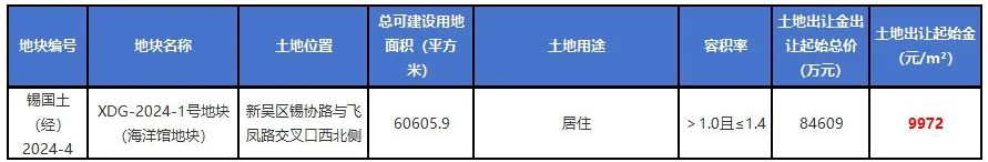 海洋馆地块:XDG-2024-1号地块,位于新吴区鸿山街道锡协路与飞凤路交叉口西北侧,占地面积60605.9㎡,容积率>1.0且≤1.4,规划为居住用地。地块起拍总价84609万元,折合楼面单价9972元/㎡。根据地块规划指标,地块日后或以洋房、小高层等低密产品为主。