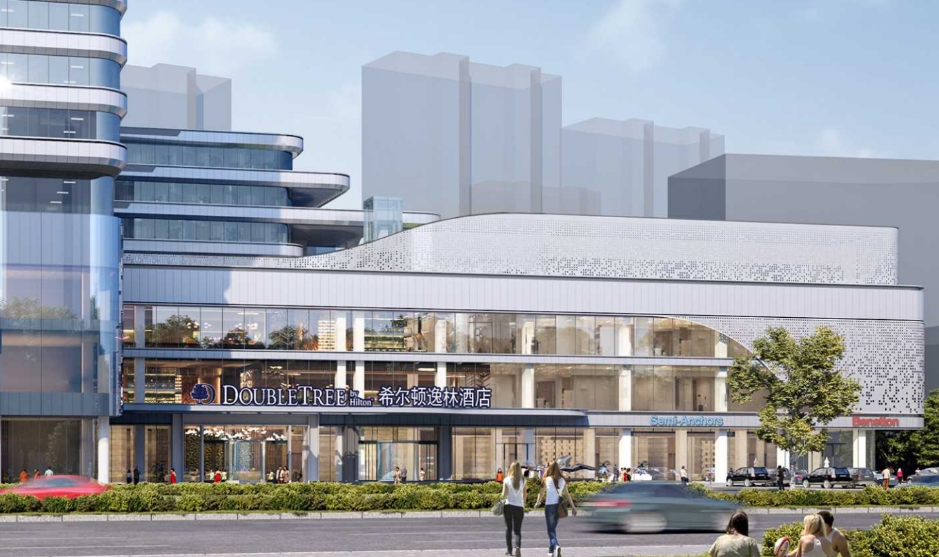 根据鸟瞰示意图,酒店外立面标有“double tree”英文字样,单体效果图内也标有“希尔顿逸林酒店”字样。