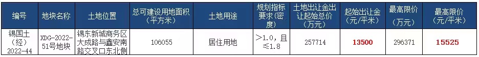 锡山人民医院东地块——XDG-2022-51号地块位于大成路与鑫安南路交叉口东北侧,占地面积约106055㎡,在近年来出让的地块中算得上是体量较大的了。地块容积率>1.0且≤1.8,出让起始价为257714万元,起始楼面价约为13500元/平米,最高限价楼面价15525元/平米。