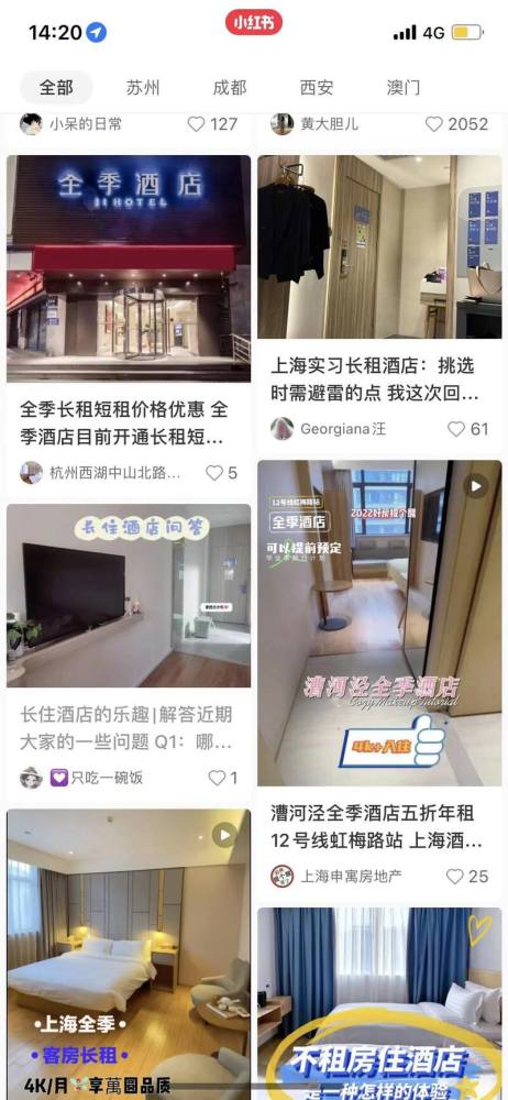 但从帖子内容来看,北京、深圳、杭州等地的实测体验帖数远高于上海。在上海长租酒店相关的词条下,更多的是房产经纪人、中介机构、酒店等为了宣传长租产品而发布的介绍帖,实测帖则集中在实习、学习、短期工作等领域,租用时长在1—3个月。