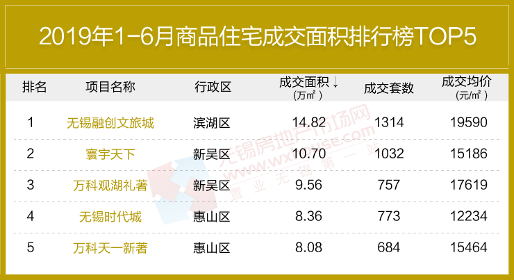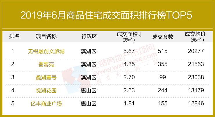 如果成交结构数据的说服力还不够,我们再来看看今年上半年以及6月无锡商品住宅成交面积排行榜。