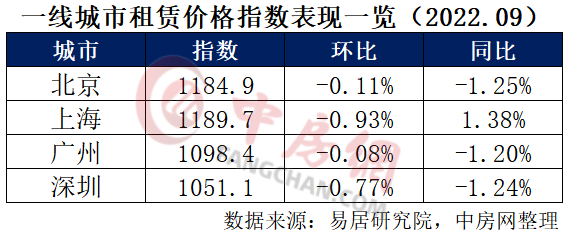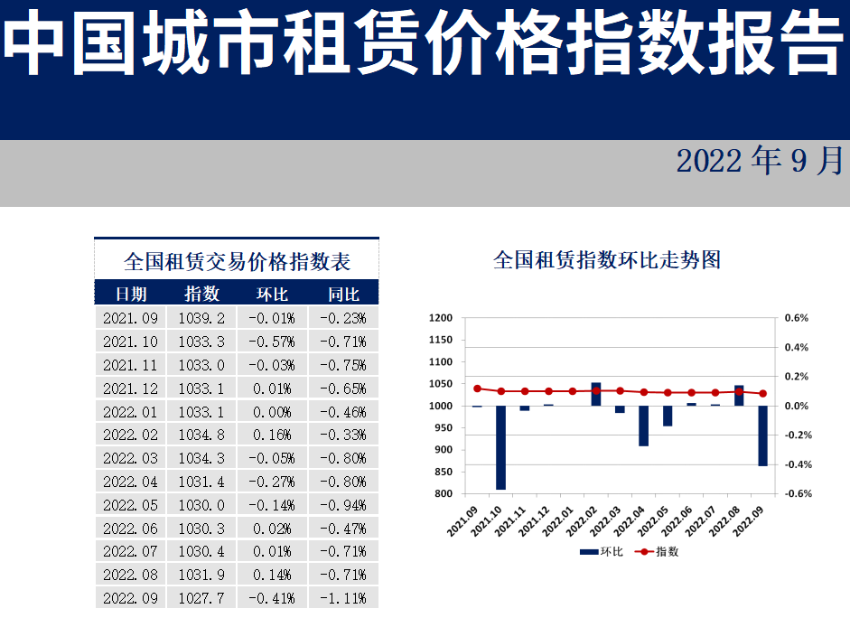 近日,由易居企业集团、上海易居房地产研究院、华东师范大学东方房地产研究院三方共同发布的《中国城市住房租赁价格指数报告》显示,2022年9月,中国城市租赁价格指数为1027.7点,较上月下降4.2点,环比下跌0.41%,同比跌幅1.11%。值得注意的是,该指数在连续三个月上涨后再次下跌。