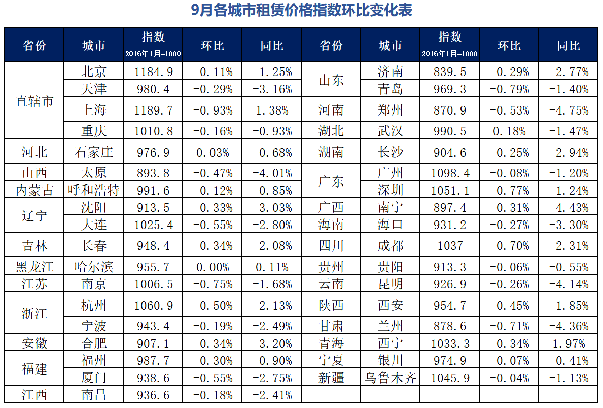 从环比方面看,监控的35个城市中,上涨城市数量比8月份减少9个城市,只有武汉(0.18%)和石家庄(0.03%)两个城市租赁价格指数出现上涨。有32个城市(乌鲁木齐、贵阳、银川、广州、北京、呼和浩特、重庆、南昌、宁波、长沙、昆明、海口、天津、济南、福州、南宁、沈阳、长春、合肥、西宁、西安、太原、杭州、郑州、大连、厦门、成都、兰州、南京、深圳、青岛、上海)租赁价格指数出现不同程度下跌,下跌城市数量比8月份增加13个城市,且跌幅均未超1%。其中,上海(-0.93%)、青岛(-0.79%)和深圳(-0.77%)跌幅靠前。除此之外,仅哈尔滨1个城市租赁价格指数与8月份持平。