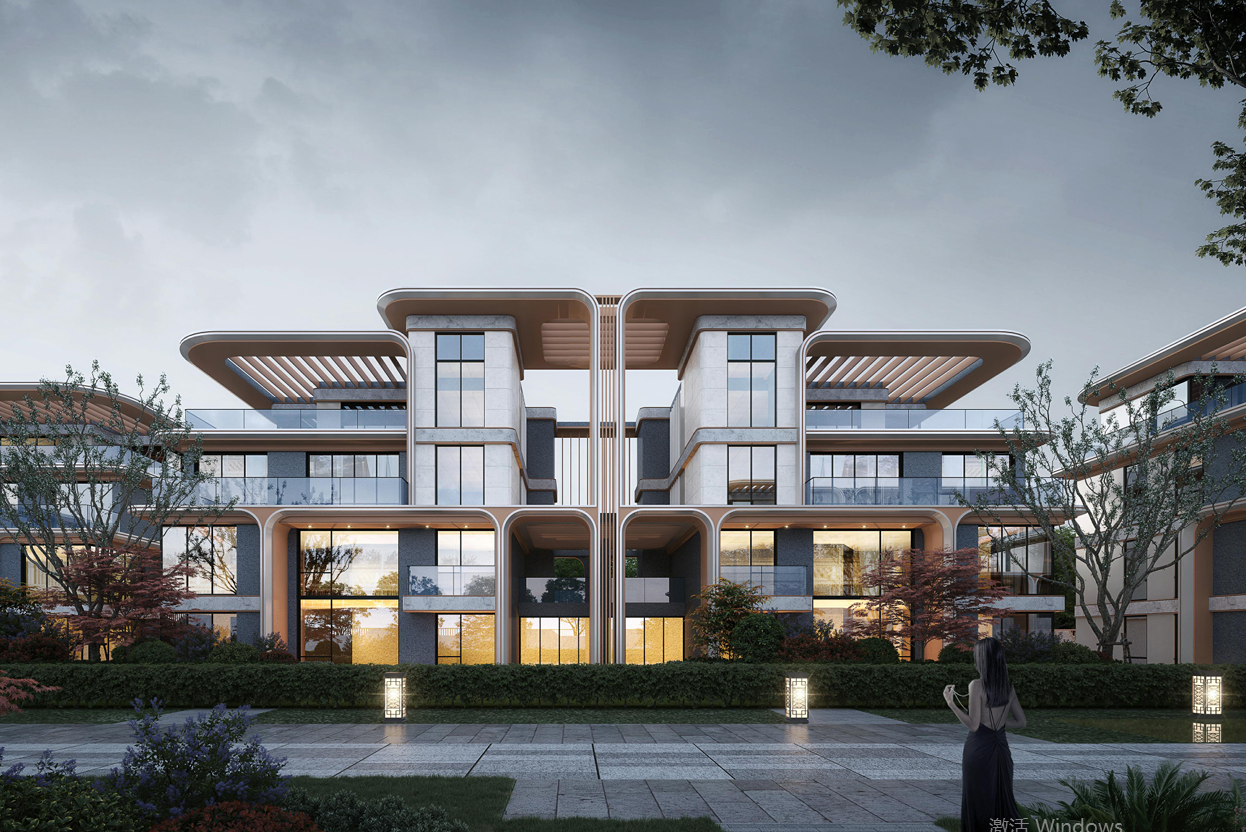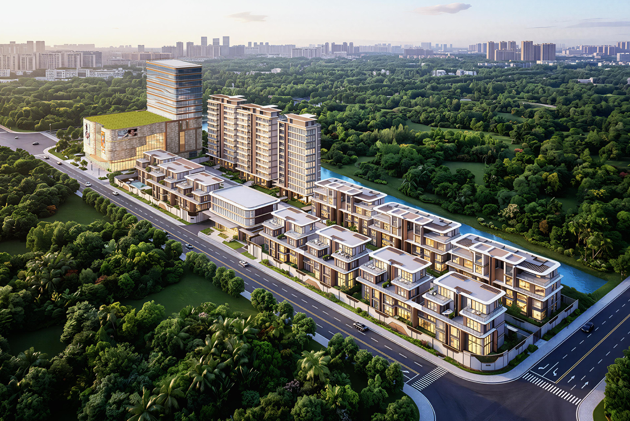 商业建筑位于整个社区的西侧,社区楼栋分两行排布,西北两侧水系环绕;主入口设置在锦湖路。从效果图来看,项目采用现代简约风格,小高层外立面大面宽玻璃幕墙既提升立面质感,又最大化保障室内采光与观景视野,金属铝板线条+棕色楼体配色沉稳大气。