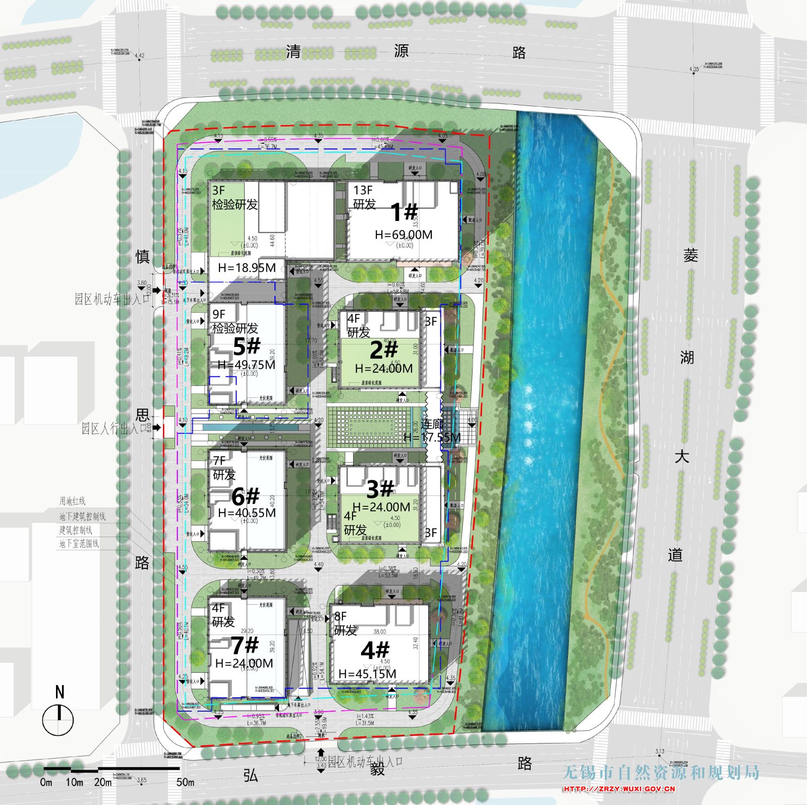 项目位于新吴区清源路以南,弘毅路以北,慎思路以东,具区河以西,建设单位为无锡生命科学产业发展有限公司。可建设用地面积约25723.2平方米,总建筑面积约11.39万平方米。建筑密度41.3%,容积率3.00,绿地率30.0%,主要经济技术指标基本满足规划设计条件要求。