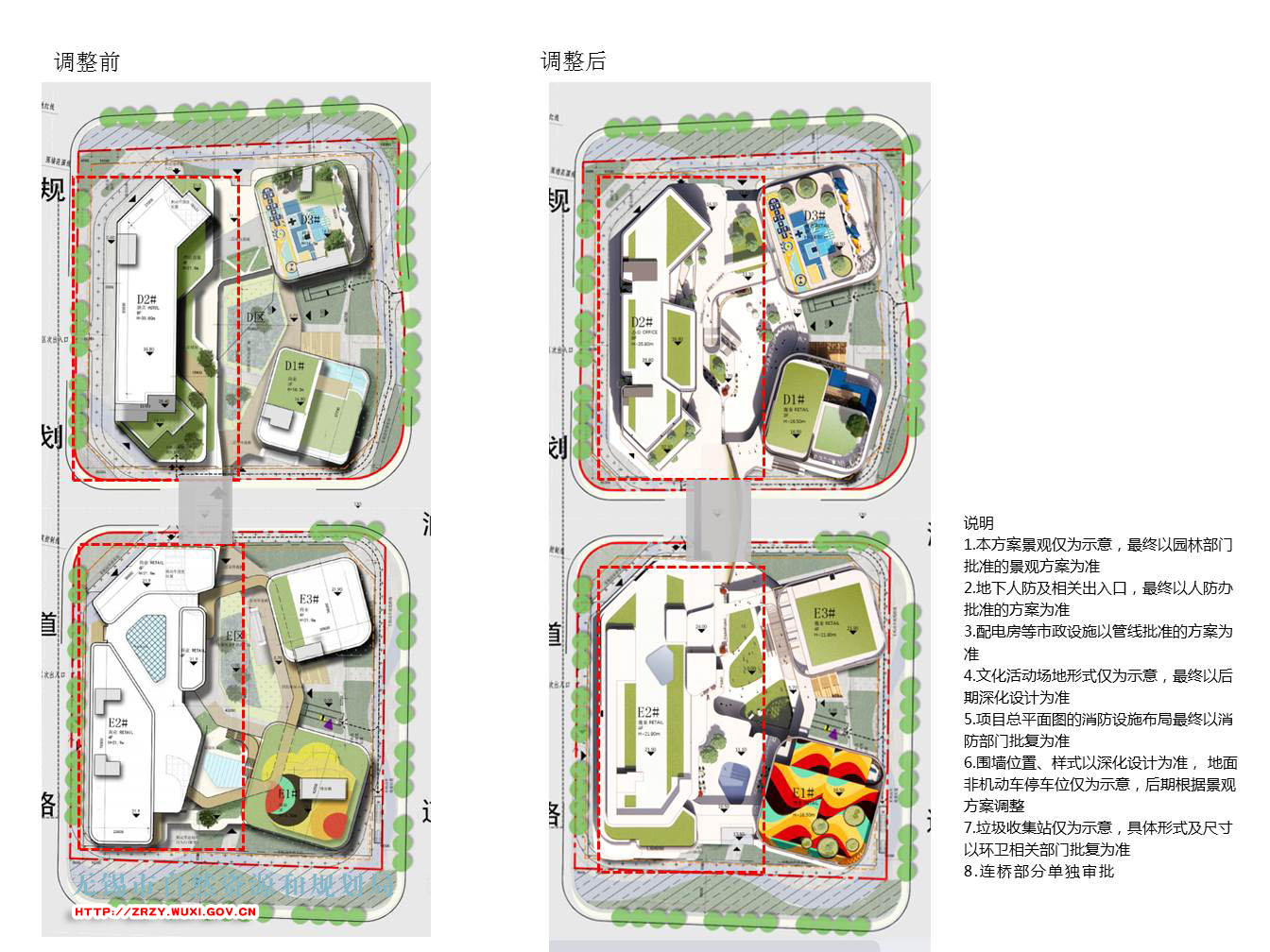 XDG-2021-68号地块开发建设项目(DE区)位于无锡经济开发区清源路与丰润道交叉口西南侧,建设单位为无锡城亿置业有限公司。可建设用地面积D区约1.56万平方米,E区约1.49万平方米,用地性质为商业、商务办公用地。建设单位为满足不同业主使用需求、优化人居环境,将D区酒店调整为办公,同时对整体立面进行优化设计,调整后各项指标符合规划设计条件要求(详见附图)。