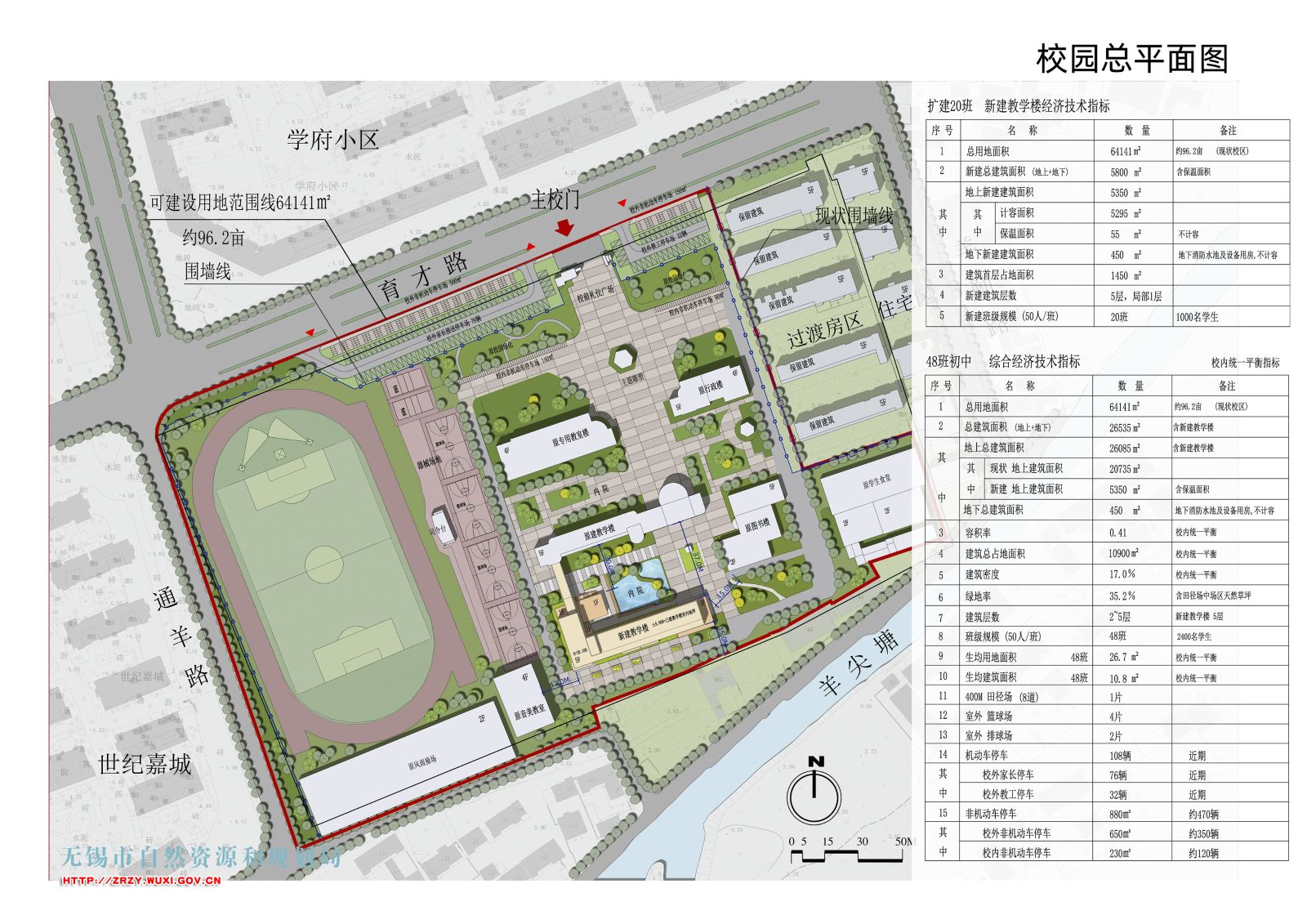 该项目位于无锡市锡山区羊尖镇育才路南、通羊路东,建设单位羊尖镇人民政府,可建设用地面积约64141平方米,本次扩建拟在原教学楼南侧新建一栋五层教学楼,扩建后总建筑面积约2.65万平方米,其中现状保留2.07万平方米,新建0.58万平方米,容积率为0.41,建筑密度为17%,绿地率为35.2%,各项指标符合相关设计要求 (具体详见规划公示图)。