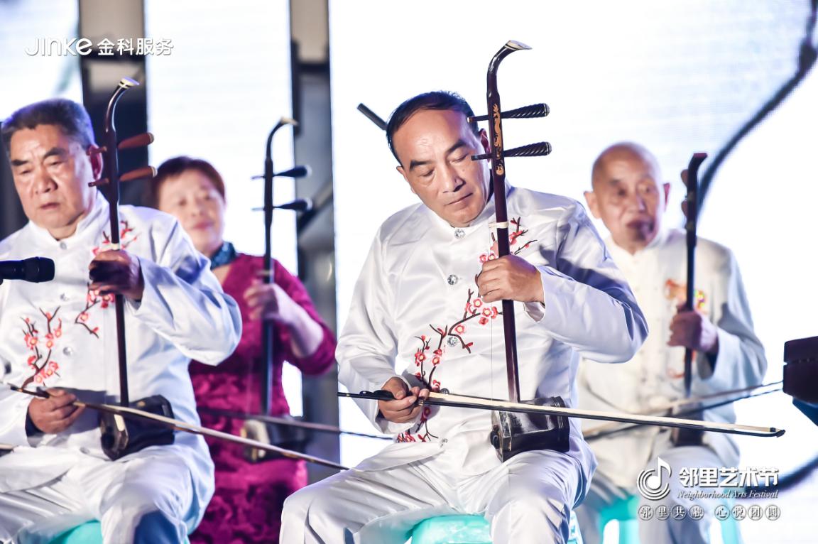 而在重庆长寿,平均年龄超过70岁的业主民乐社团身着白衫在业主的欢呼声中登上了舞台。因2018年金科家宴上的精彩表演,他们早已成为了社区里的红人,今年的中秋邻里艺术节他们为两首曲目的表演。扬琴、二胡、中胡、板胡、琵琶、中阮、古筝、竹笛……不同的音色神韵编织出一场民乐的狂欢。“能为邻居表演我们很开心,我们希望能有更多的机会向大家展示民乐的魅力,让民乐可以一直传承下去,中华的传统乐器不能没落。”表演结束后,张爷爷如是说到。
