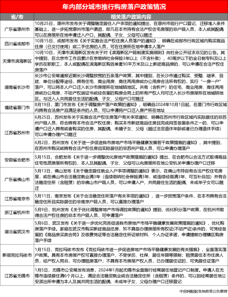 据中房网不完全统计,2024年以来,全国至少有江苏省苏州市、南京市、无锡市,广东省惠州市、佛山市,四川省成都市,福建省厦门市,安徽省合肥市,浙江省杭州市,湖南省长沙市、湖北省武汉市,新疆克拉玛依市和天津市滨海新区13地出台了购房即可申请落户的相关政策。