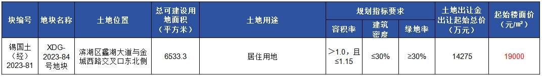 位于滨湖区蠡湖大道与金城西路交叉口东北侧,出让面积6533.3㎡,规划为居住用地,容积率>1.0.且≤1.15,起拍总价14275万元,折合楼面单价19000元/㎡。