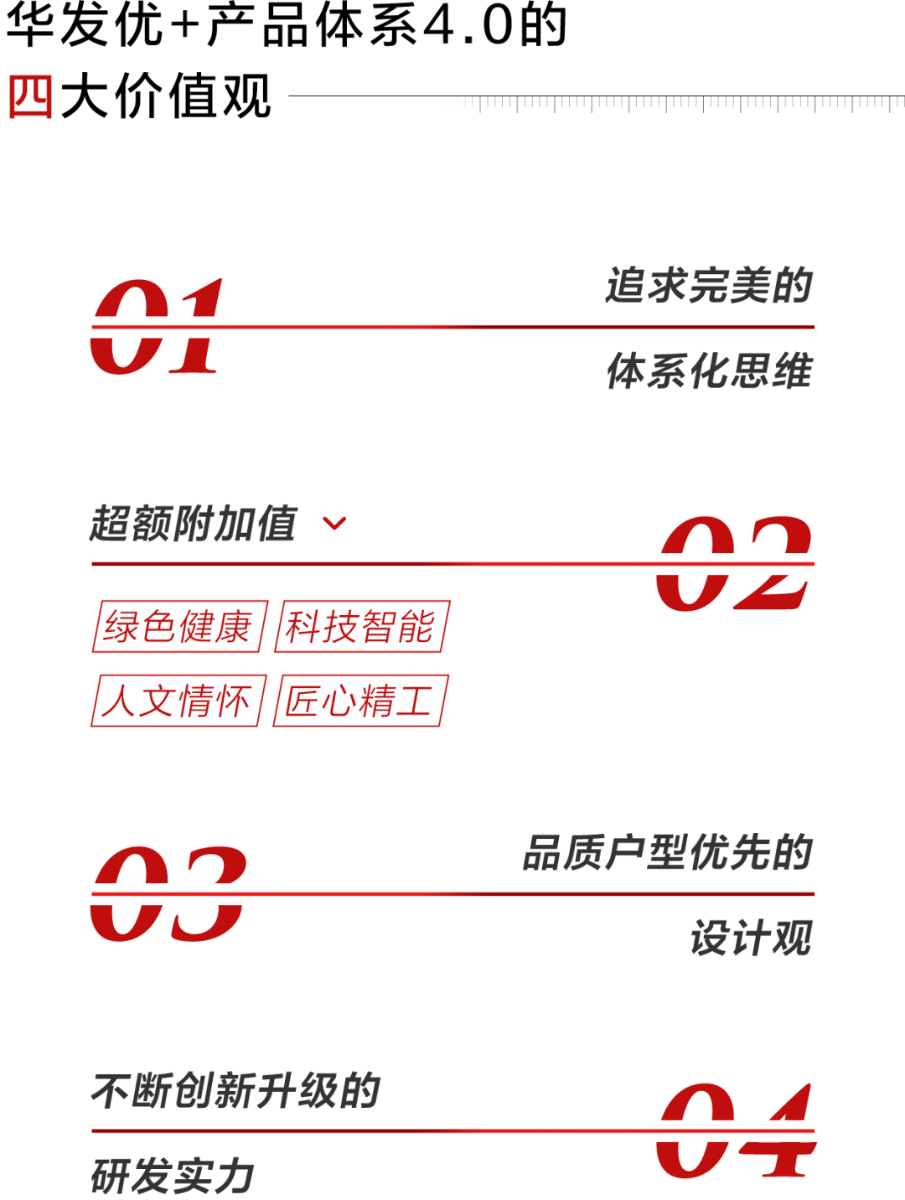 华发优+产品体系4.0的“心法”,即四大价值观——追求完美的体系化思维、超额附加值、品质户型优先的设计观、不断创新升级的研发实力。