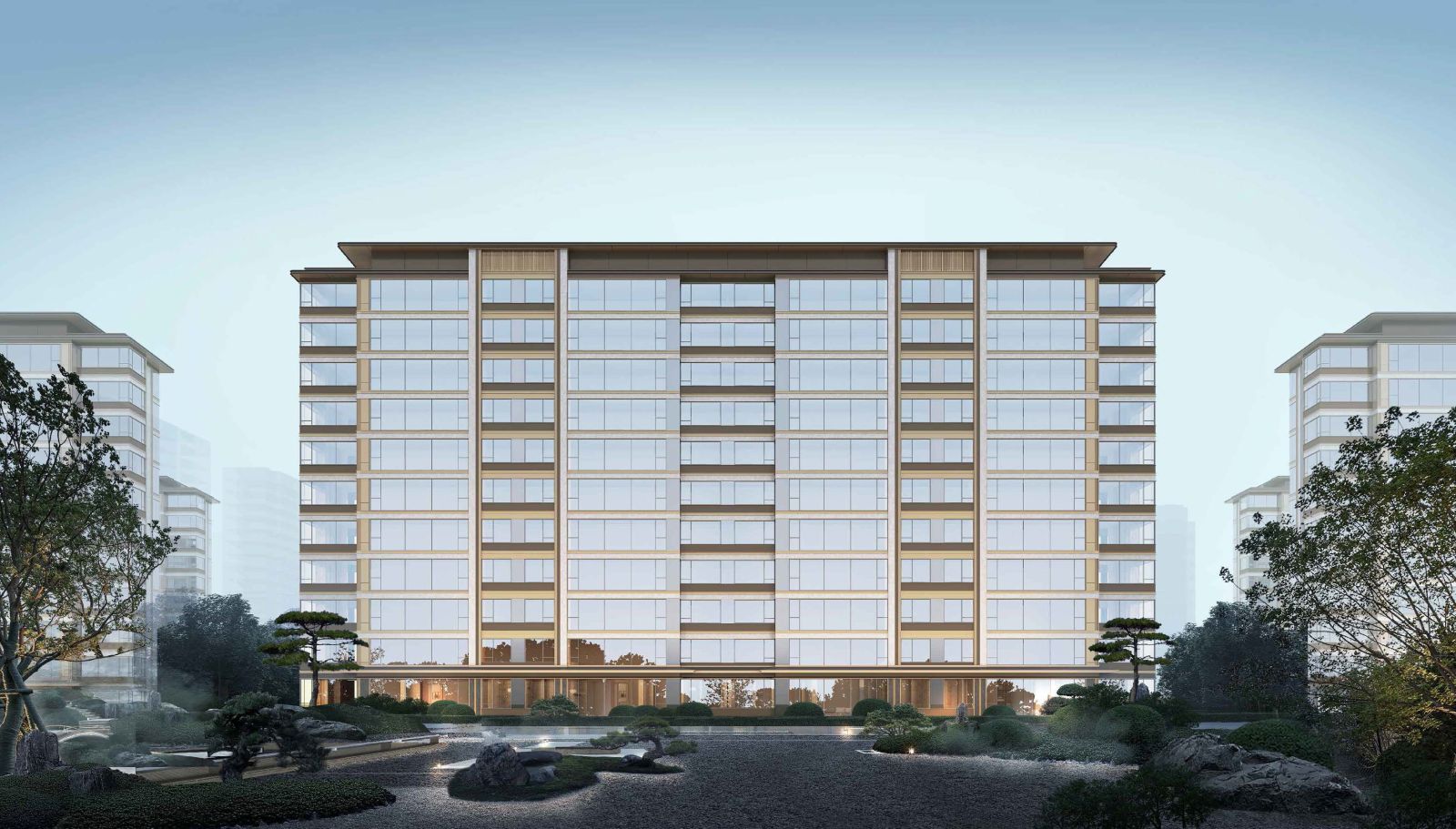 从平面图来看,小区人行主入口设置在华夏北路,车行入口在春联路上,内部设置有水景、活动绿地等。整个社区建筑呈南低北高、东西对称排布,南侧紧邻老兴塘河,塑造流畅开阔、通透舒朗的滨水空间形象。从建筑单体效果图看,以大面积落地玻璃幕墙搭配香槟色金属铝板,简洁大气,也是市面上主流的现代风格。