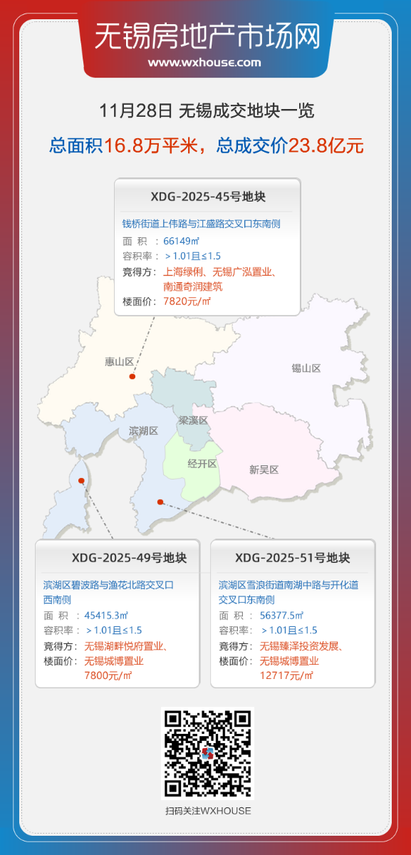 11月28日,无锡3宗住宅用地成功竞拍,总面积约16.8万㎡,总成交金额约23.8亿元,含惠山区1幅、滨湖区2幅,最高成交楼面价12717元/㎡!