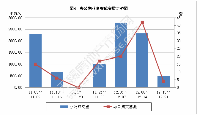 本周办公物业备案成交面积为0.05万平方米,环比减幅79.26%;备案成交套数为4套,环比减少38套。