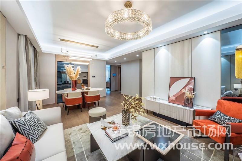 山河万物为爱情地产梁溪新作,将爱情地产的健康、绿色、智慧融入到项目的建设中,引入科技健康住宅设计理念,融合先进住宅技术,将打造健康生活方式。山河万物总占地3.5万方,总建面14.7万方,容积率1.9,总规划700余套房源,整体采用现代建筑风格,建筑首层架空的设计,赋予项目更多创意互动空间。项目户型以改善型居住需求为设计因素,规划打造17栋住宅产品,总高9至17层。图为山河万物122平米样板间餐客厅。 -