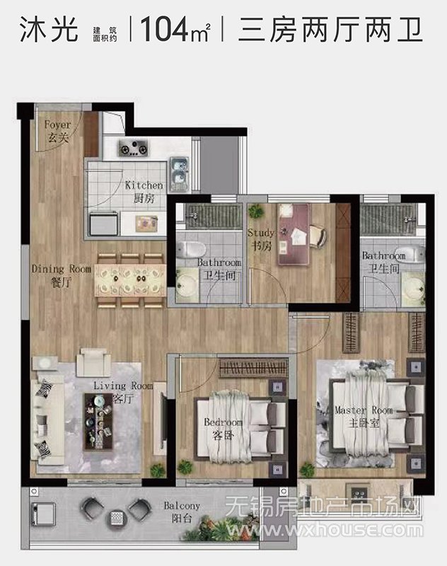 3室2厅2卫 建筑面积约:104.0㎡沐光户型