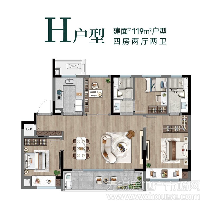 4室2厅2卫 建筑面积约:119.0㎡洋房H户型
