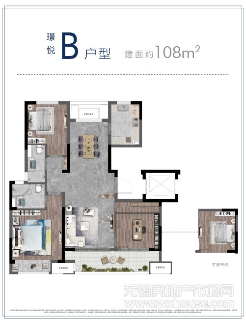 3室2厅2卫 建筑面积约:108.0㎡B户型璟悦