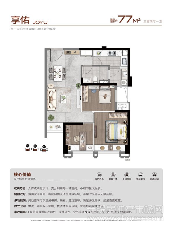 3室2厅1卫 建筑面积约:77.0㎡享佑户型