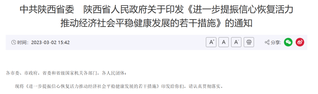 3月2日,陕西省政府发布了《进一步提振信心恢复活力推动经济社会平稳健康发展的若干措施》,从着力扩大有效投资、推动消费加快恢复、推动工业稳定增长等十个方面出台了50项措施。