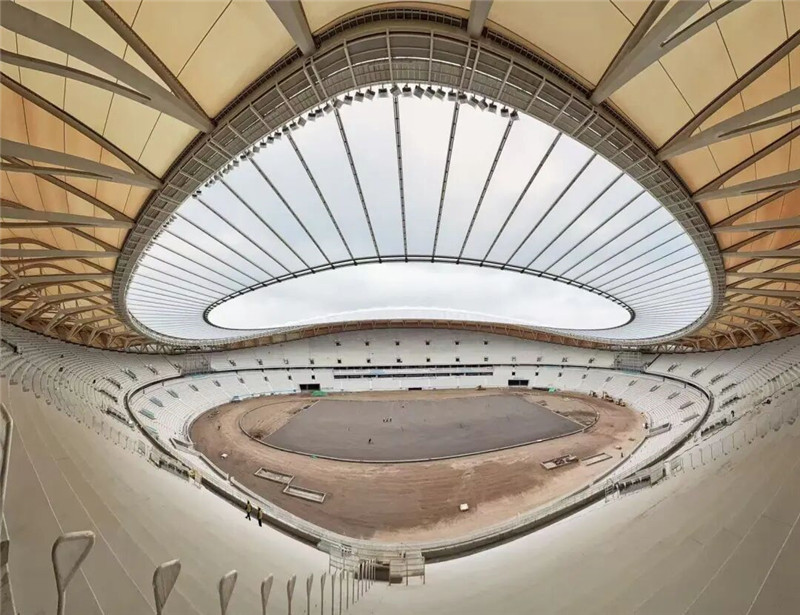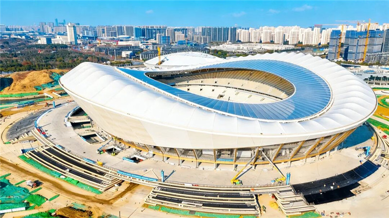 抬头仰望,屋面一圈顶膜全部闭合,整座体育场主体结构基本呈现,随着精细化装修推进,太湖之畔这只“白鹭”羽翼愈发丰满,即将全面呈现。