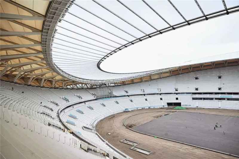 上午9时,登上体育场看台中央,放眼望去,场中心地面草坪和跑道轮廓已初显,环绕场中央的5层看台“骨架”和“外皮”基本完工,只差最后座椅安装。