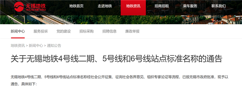 关于无锡地铁4号线二期、5号线和6号线站点标准名称的通告