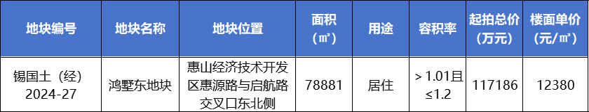 位于惠山经济技术开发区惠源路与启航路交叉口东北侧,占地面积78881㎡,规划为二类城镇住宅用地,容积率>1.01且≤1.2,土地出让起始总价117186万元,折合楼面单价12380元/㎡。