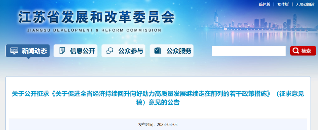 江苏发改委公布了关于公开征求《关于促进全省经济持续回升向好助力高质量发展继续走在前列的若干政策措施》(征求意见稿)意见的公告。