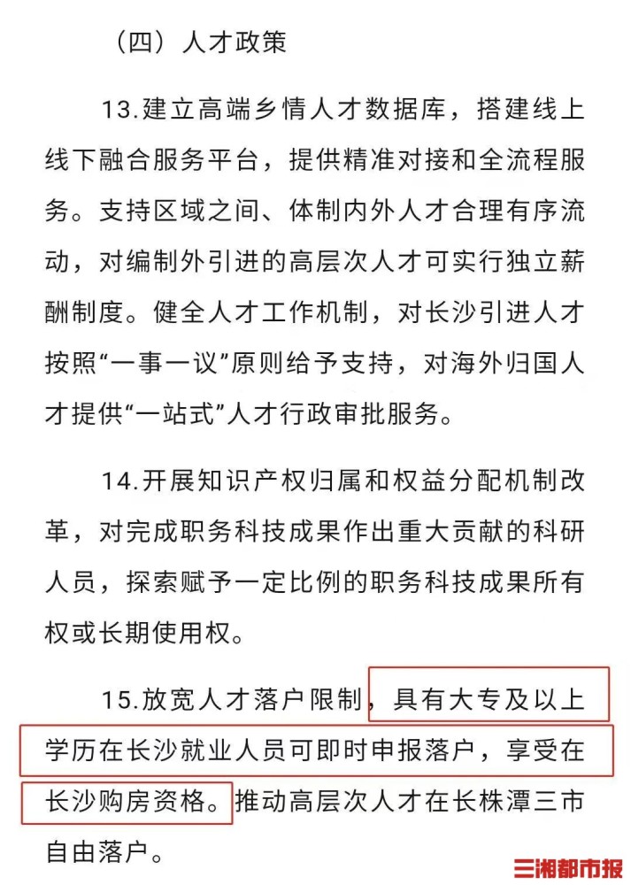 “重大政策利好,长沙限购政策放开!”4月20日,湖南发布的《关于实施强省会战略支持长沙市高质量发展的若干意见》提出,放宽人才落户限制,具有大专及以上学历在长沙就业人员可即时申报落户,享受在长沙购房资格。