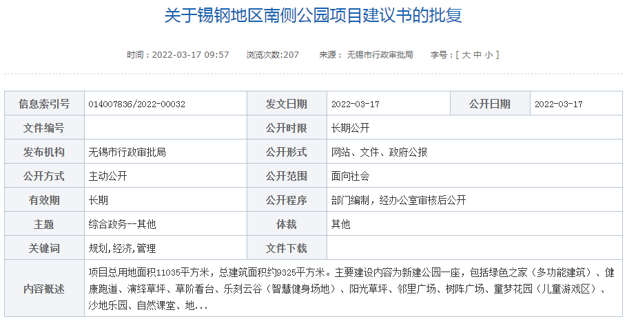 3月17日,无锡市行政审批局公示了关于锡钢地区南侧公园项目建议书的批复。