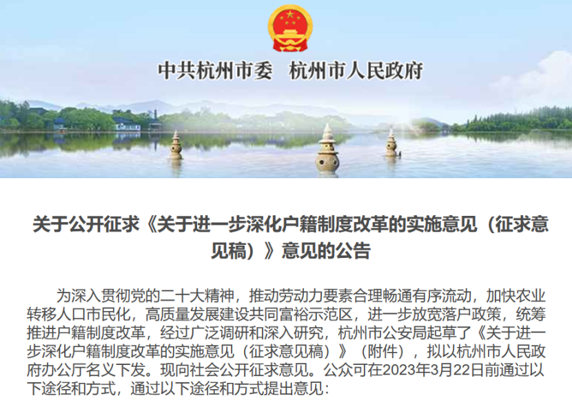 3月13日,杭州市政府发布《关于进一步深化户籍制度改革的实施意见(征求意见稿)》。
