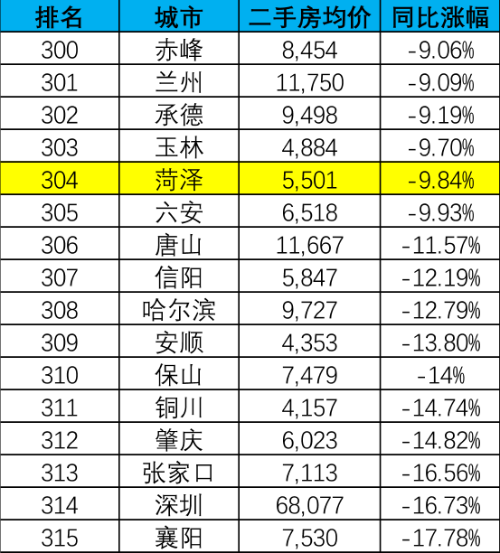 去年全国315个城市中,菏泽的二手房跌幅排在304位,是吊车尾的存在。
