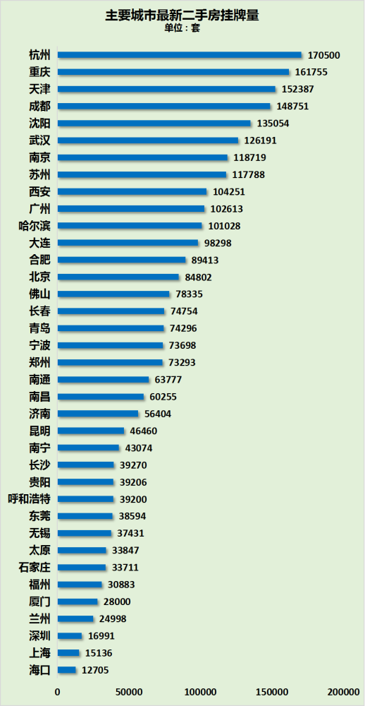 二手房挂牌量超10万套的11个中心城市名单从高到低依次为杭州、重庆、天津、成都、沈阳、武汉、南京、苏州、西安、广州、哈尔滨。