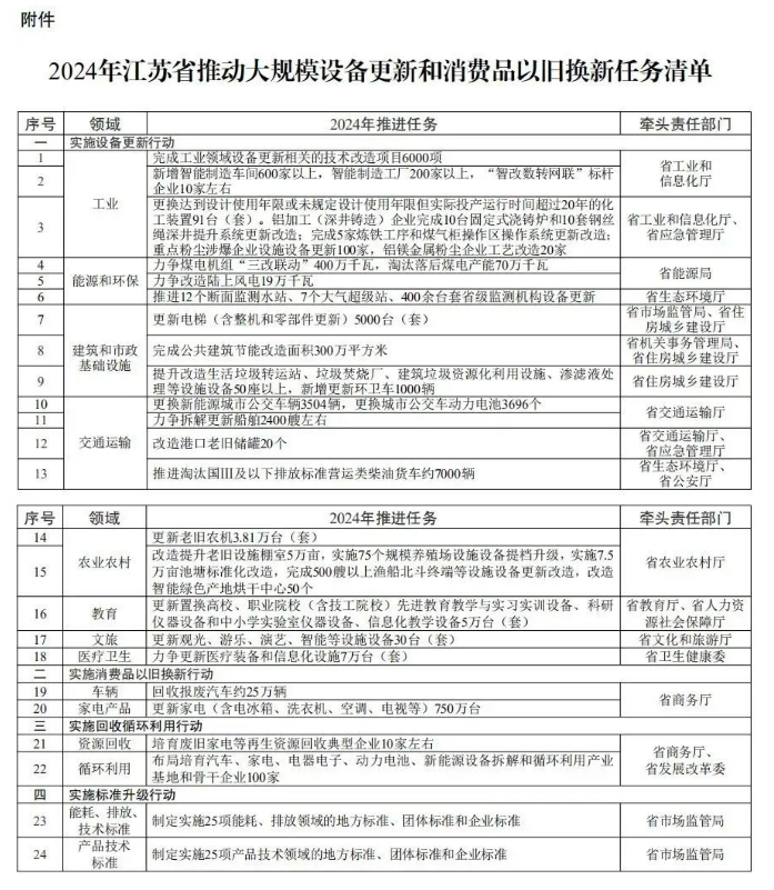 6、加快生态环境领域设备更新。实施废水、废气、固废等污染物处理设施升级改造。到2027年更新提升78个断面监测水站、4500个大气站点、14个省级监测机构的仪器设备。(省生态环境厅牵头负责)
