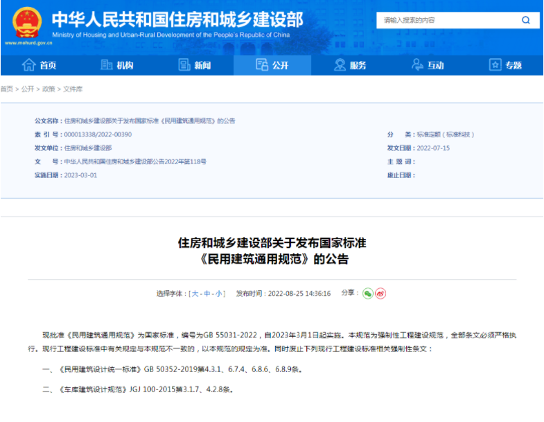 实际上,在2022年8月25日住建部官网就发布了《民用建筑通用规范》公告(国标编号GB 55031-2022),并指出本规范为强制性工程建设规范,今年3月1日新规正式实施后,全部条文必须严格执行。现行工程建设标准中有关规定与本规范不一致的,以本规范的规定为准。