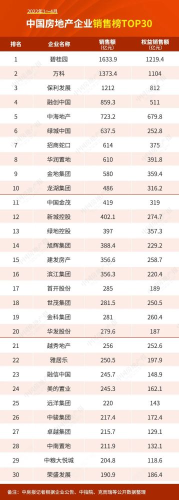 5月5日,融创中国和旭辉控股分别发布了2022年1~4月未经审核的销售数据,分别实现859.3亿元和388.4亿元合同销售额,同比减少约49.75%和53.29%。上述两家企业惨淡的成绩单几乎是前4月房地产行业缩影。