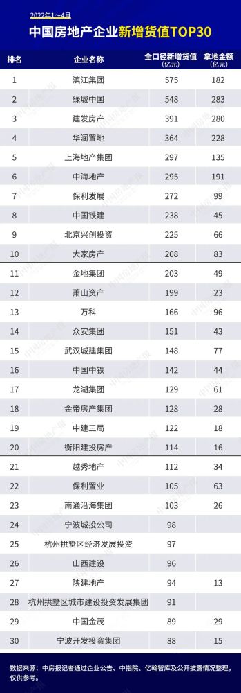 从新增货值来看,滨江集团、绿城中国和建发房产占据榜单前三位。