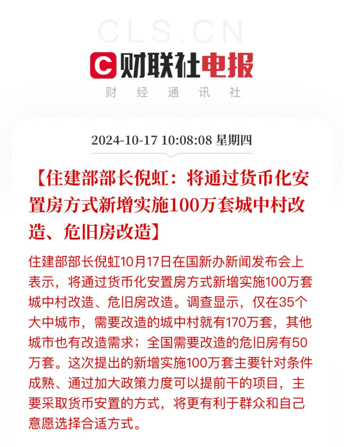 市场网首页 > 新闻中心 > 各地新闻 > 正文 住建部部长倪虹:将通过货币化安置房方式新增实施100万套城中村改造、危旧房改造 2024-10-17 10:30:30 财联社 住建部部长倪虹10月17日在国新办新闻发布会上表示,将通过货币化安置房方式新增实施100万套城中村改造、危旧房改造。调查显示,仅在35个大中城市,需要改造的城中村就有170万套,其他城市也有改造需求;全国需要改造的危旧房有50万套。这次提出的新增实施100万套主要针对条件成熟、通过加大政策力度可以提前干的项目,主要采取货币安置的方式,将更有利于群众和自己意愿选择合适方式。 (责任编辑:张一男)