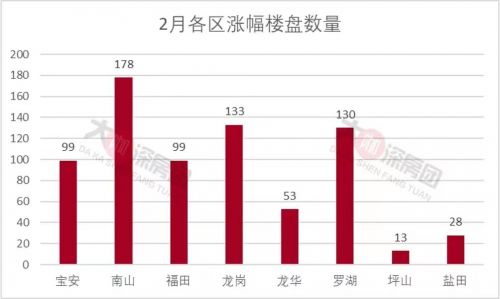 据深圳中原研究中心统计,2月份以来深圳共有733个楼盘挂盘价上涨。从片区分布来看,南山区涨幅楼盘最多,共有178个楼盘上涨;其次是龙岗区与罗湖区,分别有133与130个楼盘上涨。