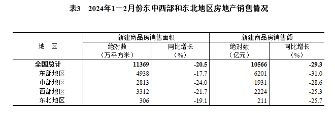 销售方面,1-2月份新建商品房销售面积11369万平方米,同比下降20.5%,其中住宅销售面积下降24.8%;新建商品房销售额10566亿元,下降29.3%,其中住宅销售额下降32.7%。