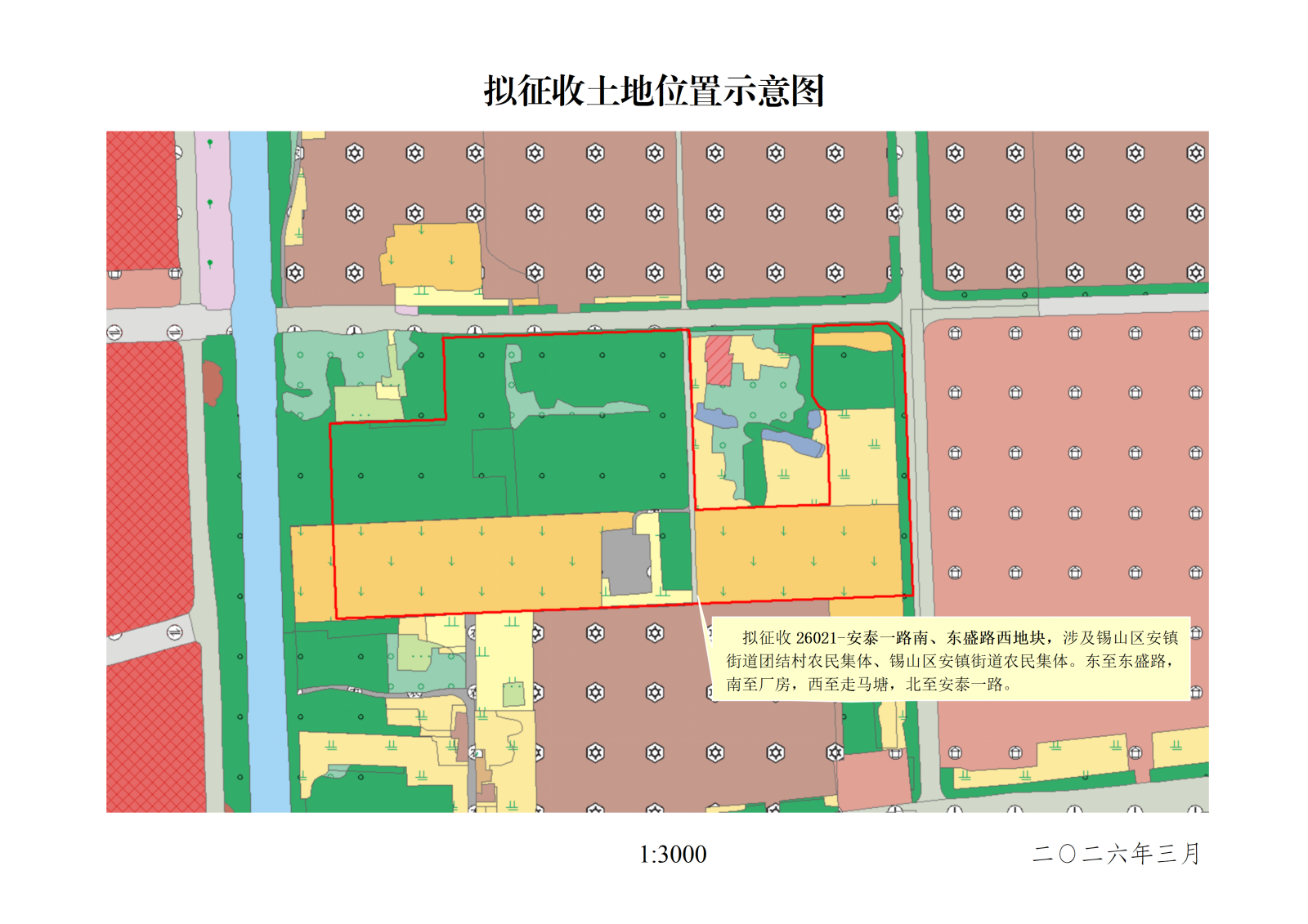 本次拟征收土地位于锡山区安镇街道团结村农民集体、锡山区安镇街道农民集体范围内。拟征收土地位置详见附图。